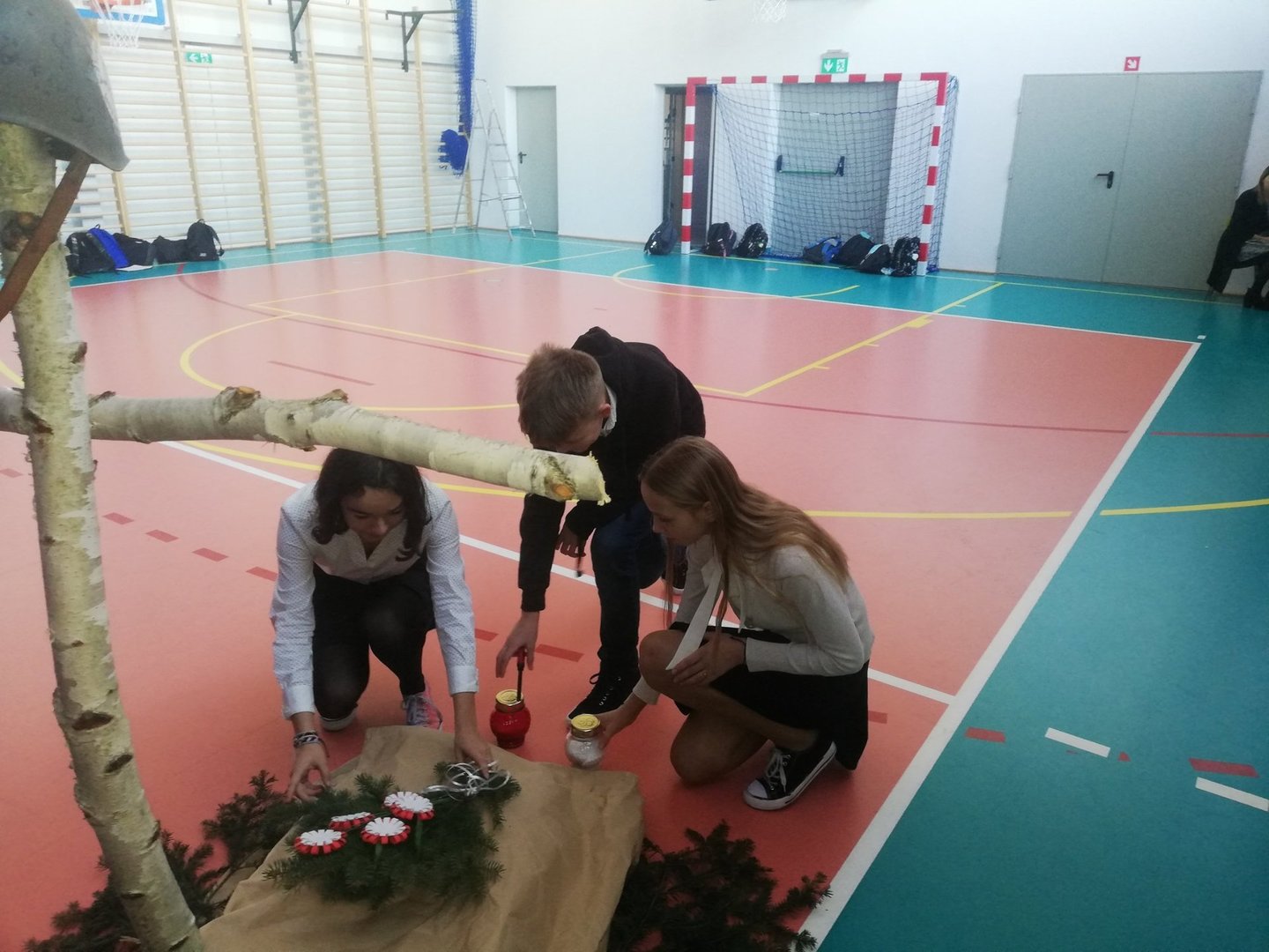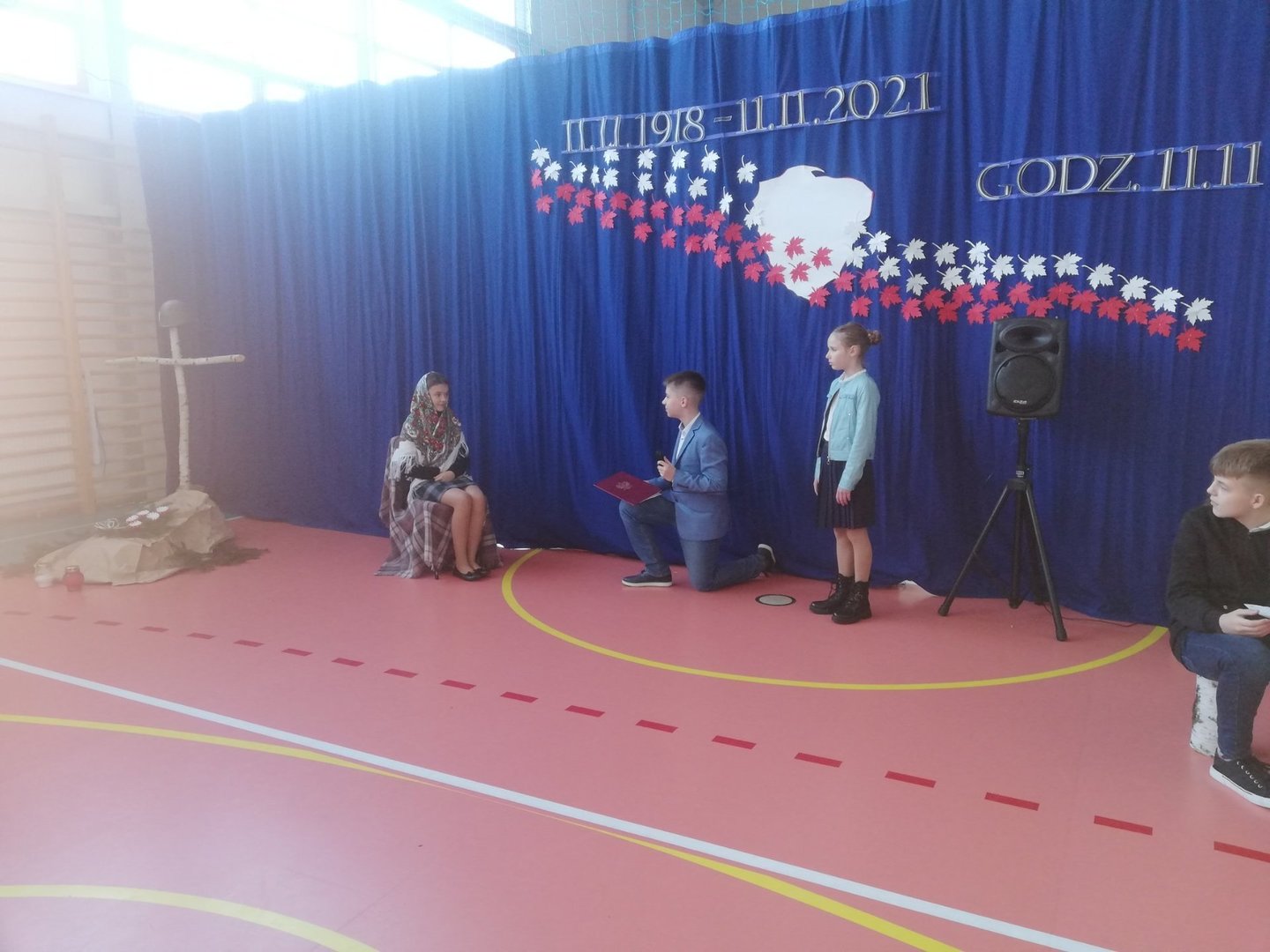 Na scenie widniał symboliczny brzozowy krzyż, pod nim grób żołnierza, gdzie uczniowie złożyli kwiaty i zapalili biały i czerwony znicz.
