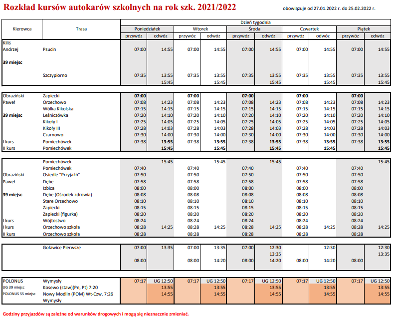 W związku z wprowadzeniem nauki zdalnej dla klas V-VIII, od 27 stycznia br. ulega zmianie rozkład kursów autokaru szkolnego dla uczniów klas I-III i oddziałów przedszkolnych, którzy uczą się stacjonarnie. Szczegóły w załączniku.