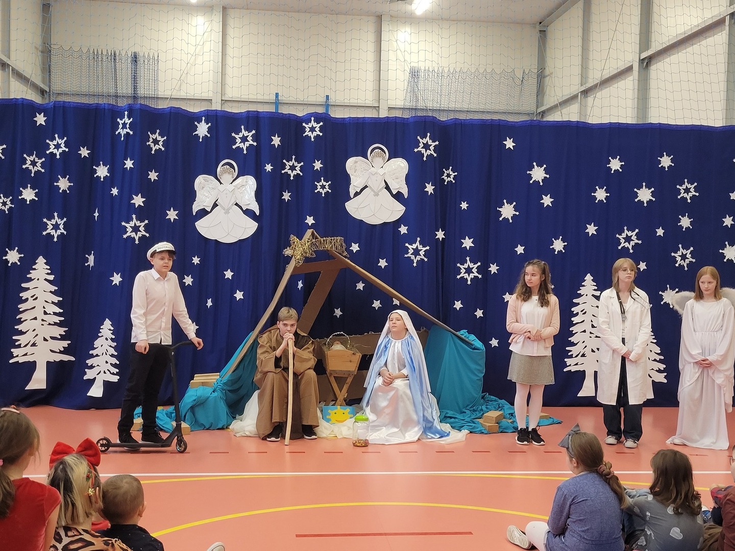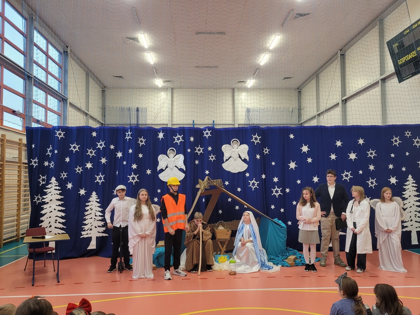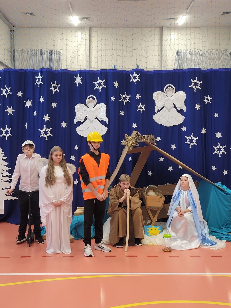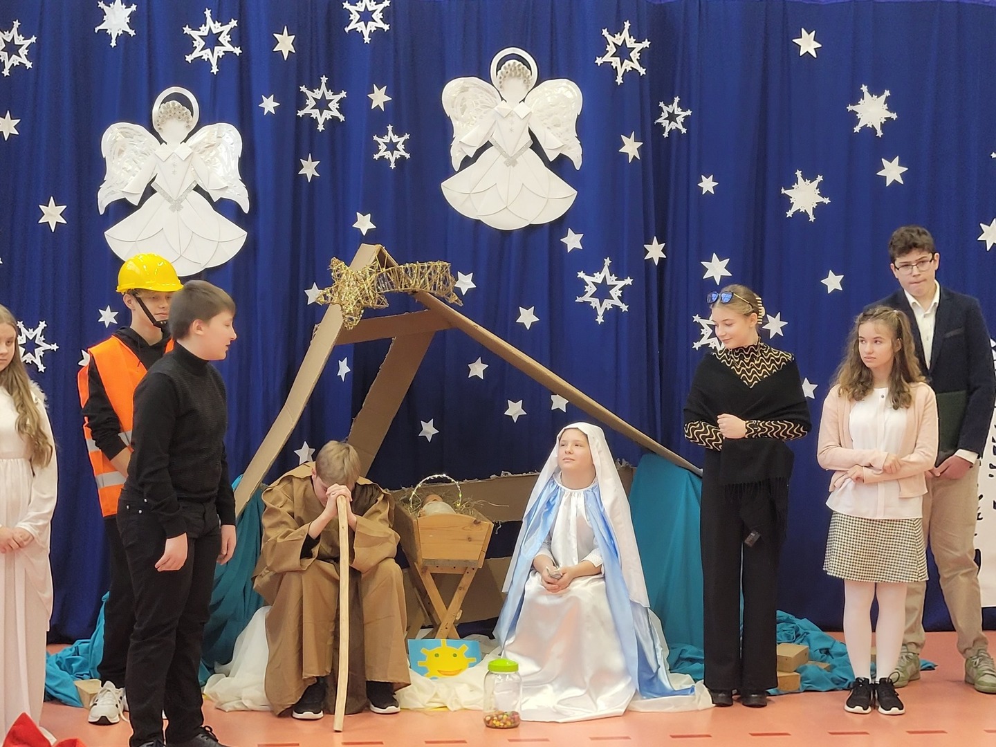 Rozpoczęliśmy go Jasełkami, które zostały przygotowane przez uczniów klas VI-VIII, pod kierownictwem p. Marzeny Klimaszewskiej. Aktorom oraz p. Marzenie składamy serdeczne gratulacje za przekazanie w ciekawy i zabawny sposób istoty i wartości Świąt Bożego Narodzenia